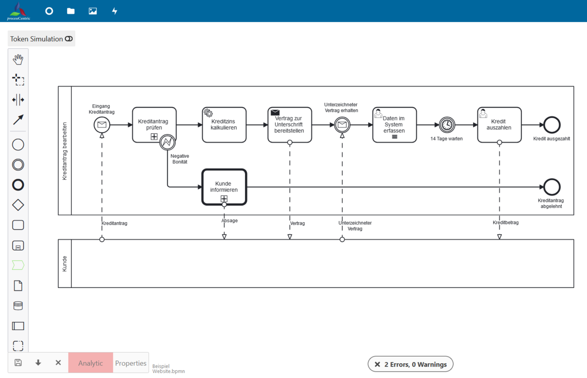 Beispielsweise wurde ein einfacher Prozess auf der deskriptiven Ebene modelliert, welcher aber noch Fehler beinhaltet und unvollständig ist. Das Tool erkennt dies und meldet es über die Fehlermeldungen gleich dem Nutzer.